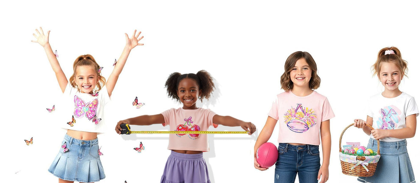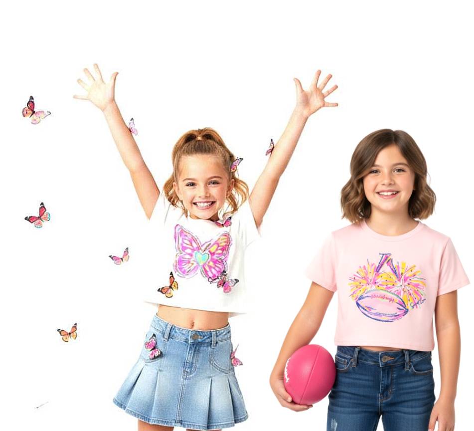 Bold, story-driven artwork by Lane and her mom, Jeanne — created using AI, digitally hand-painted, and finished with shimmer or rhinestones. These custom tees feature cut-off hems and raw crop edges for a cool, modern look, while cotton candy pinks, purples, and vibrant hues keep the vibe fun and fresh.